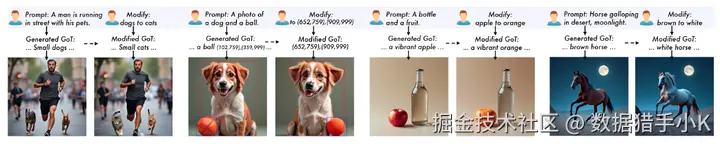 使用 GoT 框架进行交互式生成的示例。通过修改 GoT 内容(描述和边界框位置),用户可以自定义其文本到图像的过程,包括:1. 对象替换 2. 对象位置调整 3. 对象属性修改。