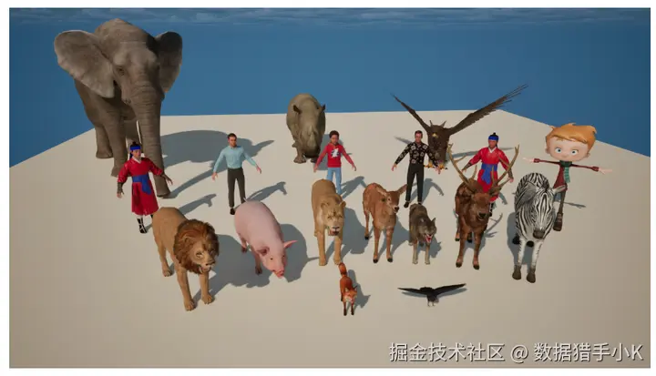 1、资产整合与运动合成:从Mixamo和Unreal Engine的MetaHuman等平台获取多样化的人类、动物和角色模型,并通过控制骨骼系统生成复杂的运动轨迹。