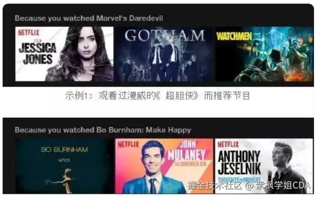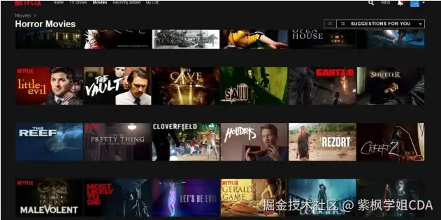 例如,如果用户花很多时间观看《The Ritual》,《The Babysitter》或《Apostle》等恐怖电影时,则Netflix会推荐类似的电影,几乎不会推荐喜剧电影,因为根据用户以往的浏览数据,用户兴趣不大。