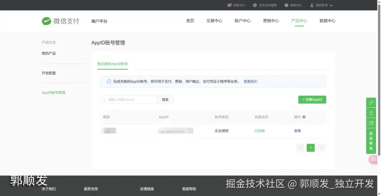 通过微信支付商户平台关联APPID。 支持已通过微信认证的服务号、政府或媒体类订阅号、小程序、企业微信、移动应用。 官方文档:kf.qq.com/faq/181105J…
