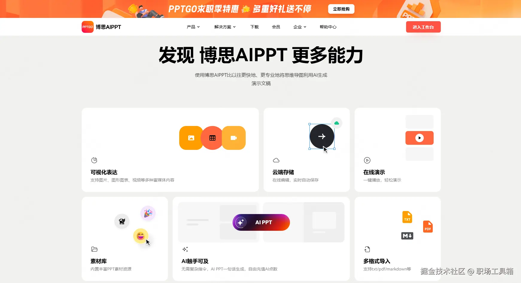 博思AIPPT提供了3大核心功能模块,可满足多样化的PPT生成场景: