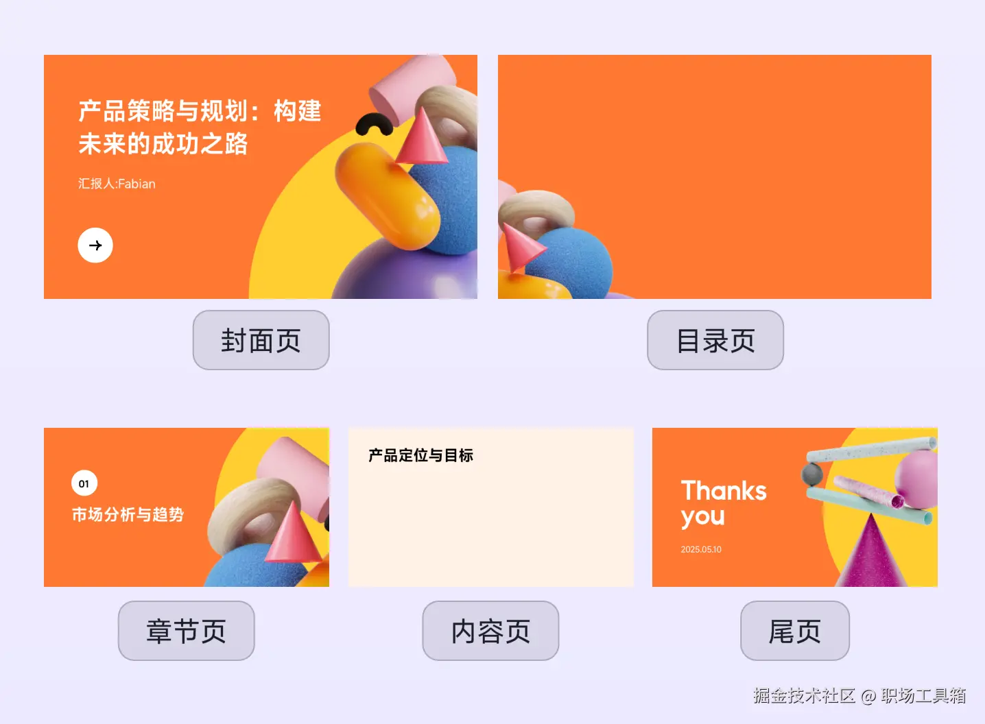 为了获得最佳效果,在导入PPT文件前需要进行简单的“预处理”:保留5个关键页面——封面页、目录页、章节页、内容页和尾页,这5个页面类型共同构成了一个完整PPT的基本骨架,删除其余页面。
