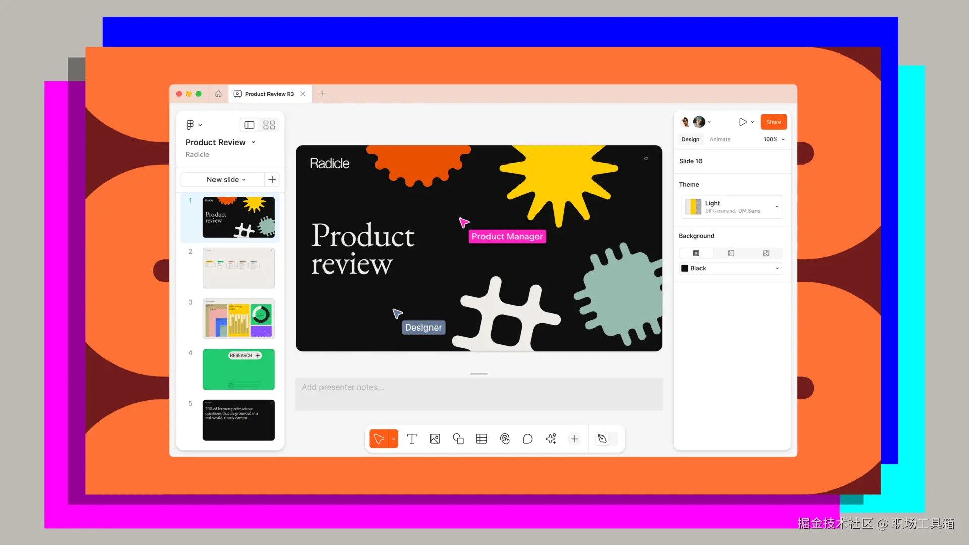 Figma Slides的一大特色是支持多用户协作,这与前面介绍的博思AIPPT、Gamma是一样的,借助这些具备协作能力的PPT工具,多个用户可以同时编辑同一个PPT演示文稿,实现实时协作,大大提高了团队工作效率。与此同时,Figma Slides还整合了实时投票、对齐比例和投票等互动元素,使演示过程更加生动有趣,增强了观众参与度和信息传递效果。