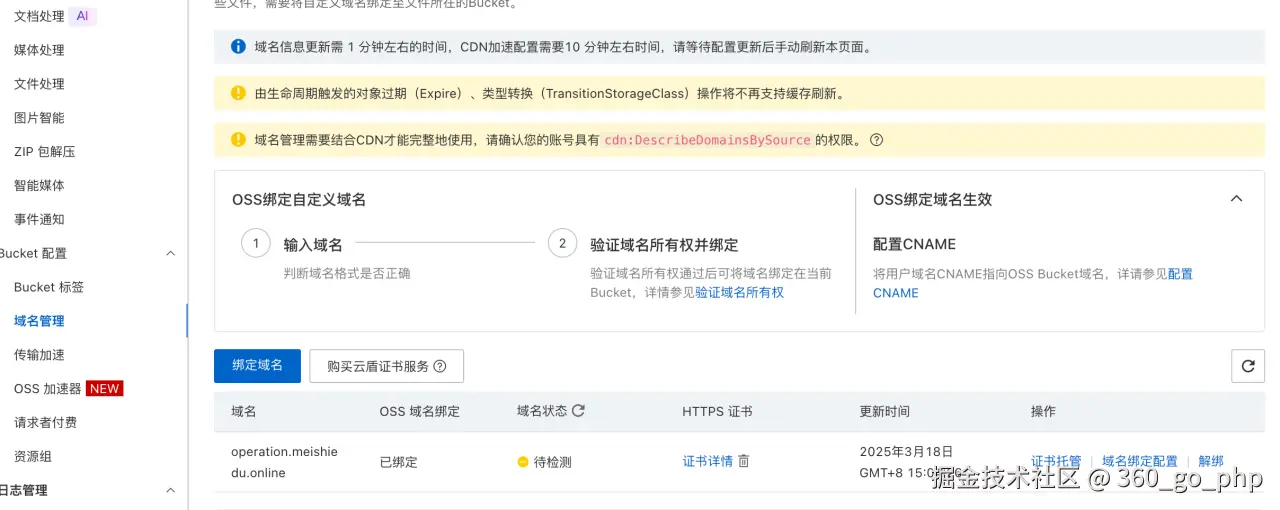 在 OSS 控制台,选择存储桶,点击 管理 -> 域名管理。