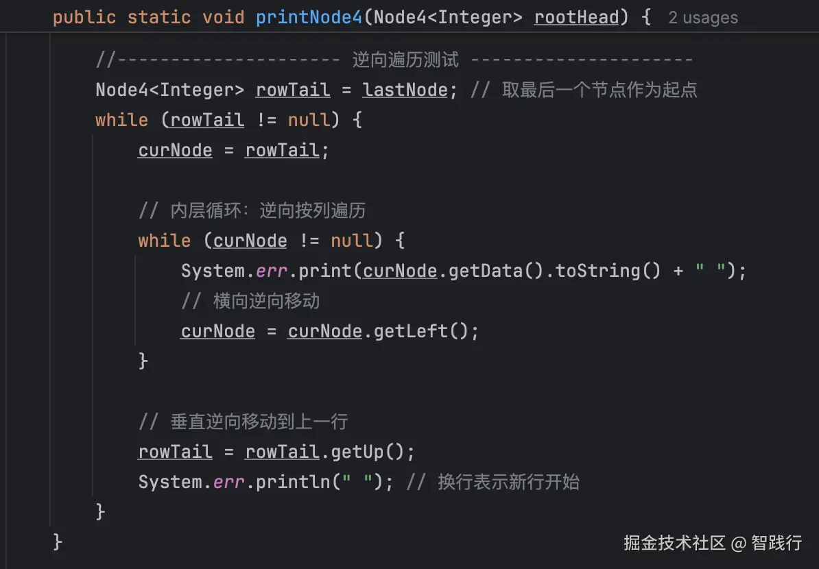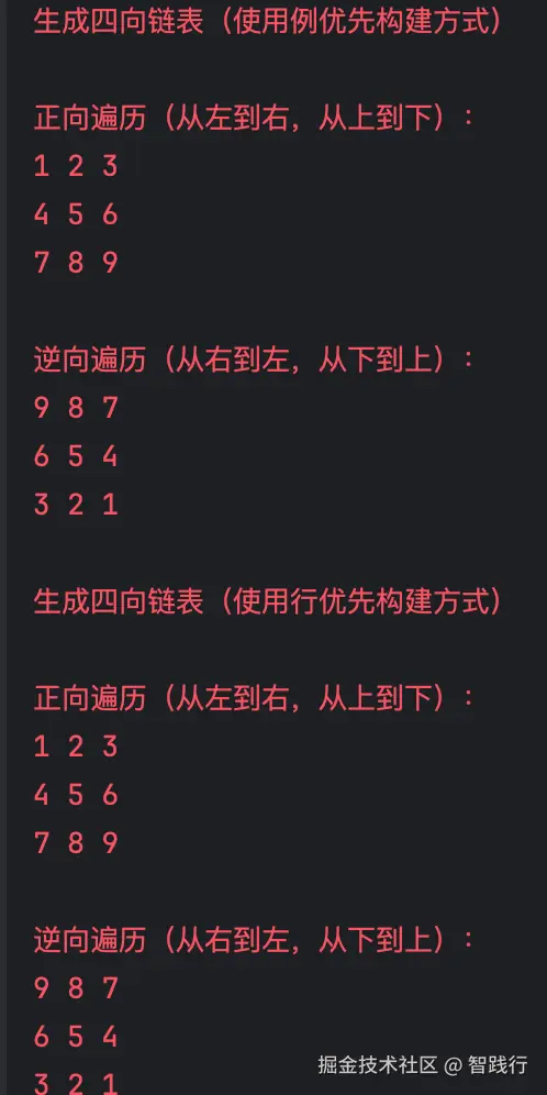这个测试用例使用双向验证,通过正向和逆向两次遍历,全面验证四个方向的指针。正向遍历时,还用lastNode记录矩阵右下角节点,实现从尾节点开始的逆向遍历。在遍历过程中进行可视化输出,通过行列对齐的打印格式,直观展示二维链表结构。