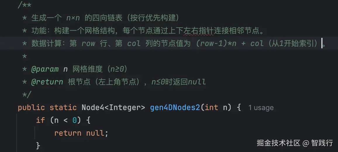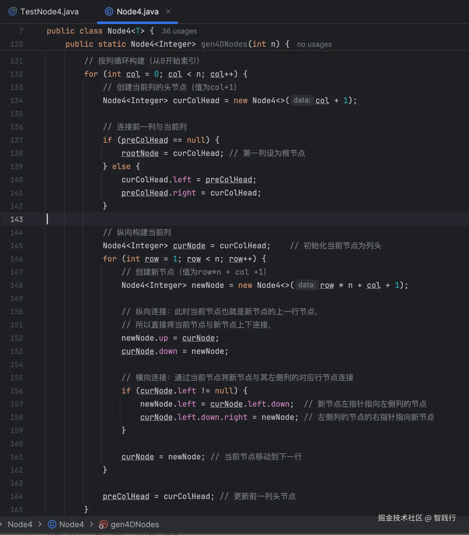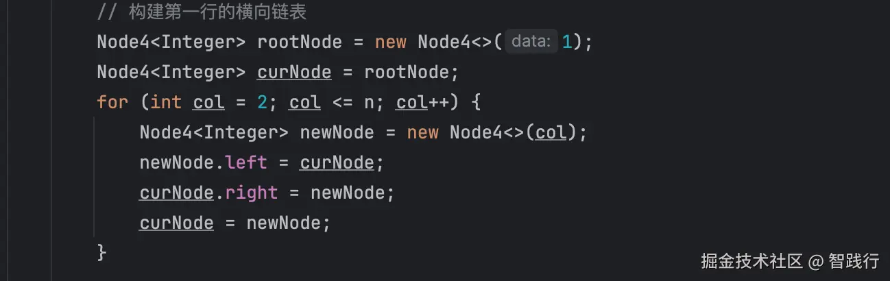 此处使用按列优先的方式依次生成n×n的四向链表。主要的实现逻辑如下: