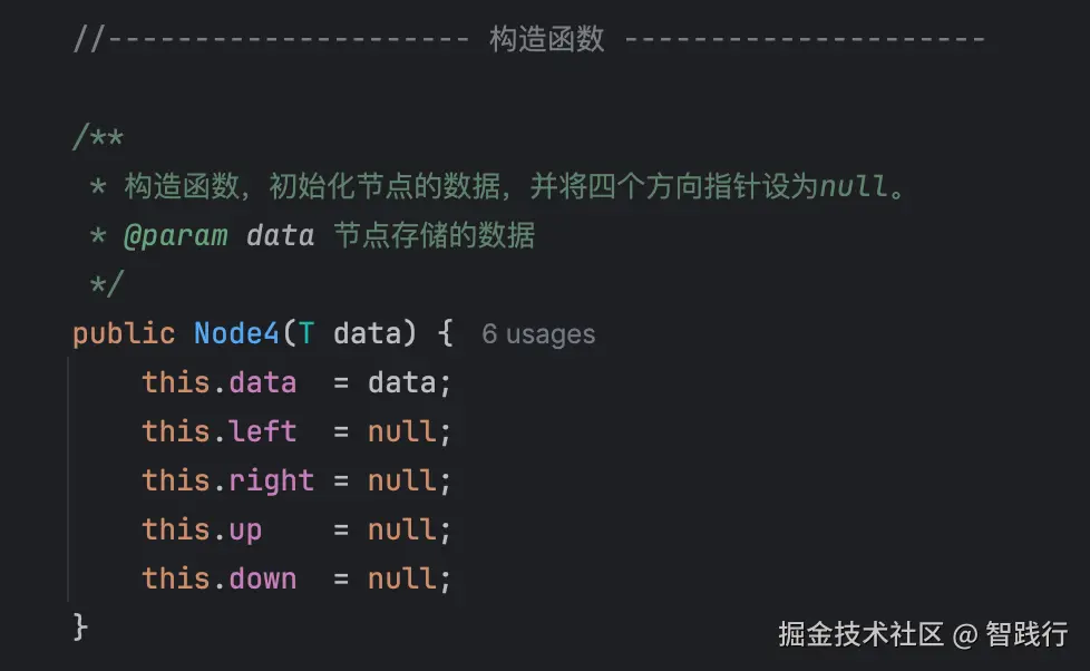 首先用泛型把四向节点Node4的类定义好, 里面有上下左右四个方向的成员变量以及节点数据data: