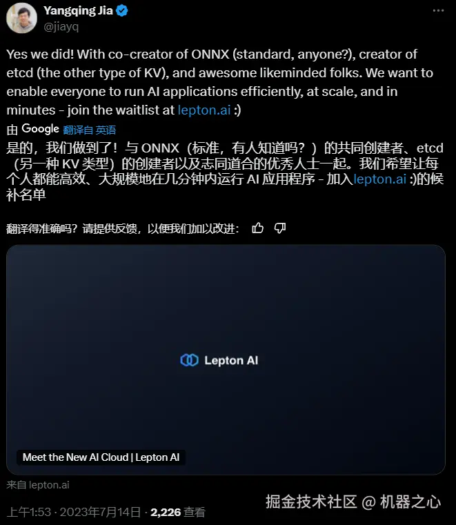 2023 年,贾扬清离开阿里成立 Lepton AI,旨在建立高效的 AI 应用平台,其创始团队来自于机器学习社区 ONNX、分布式系统研发平台 etcd 等。