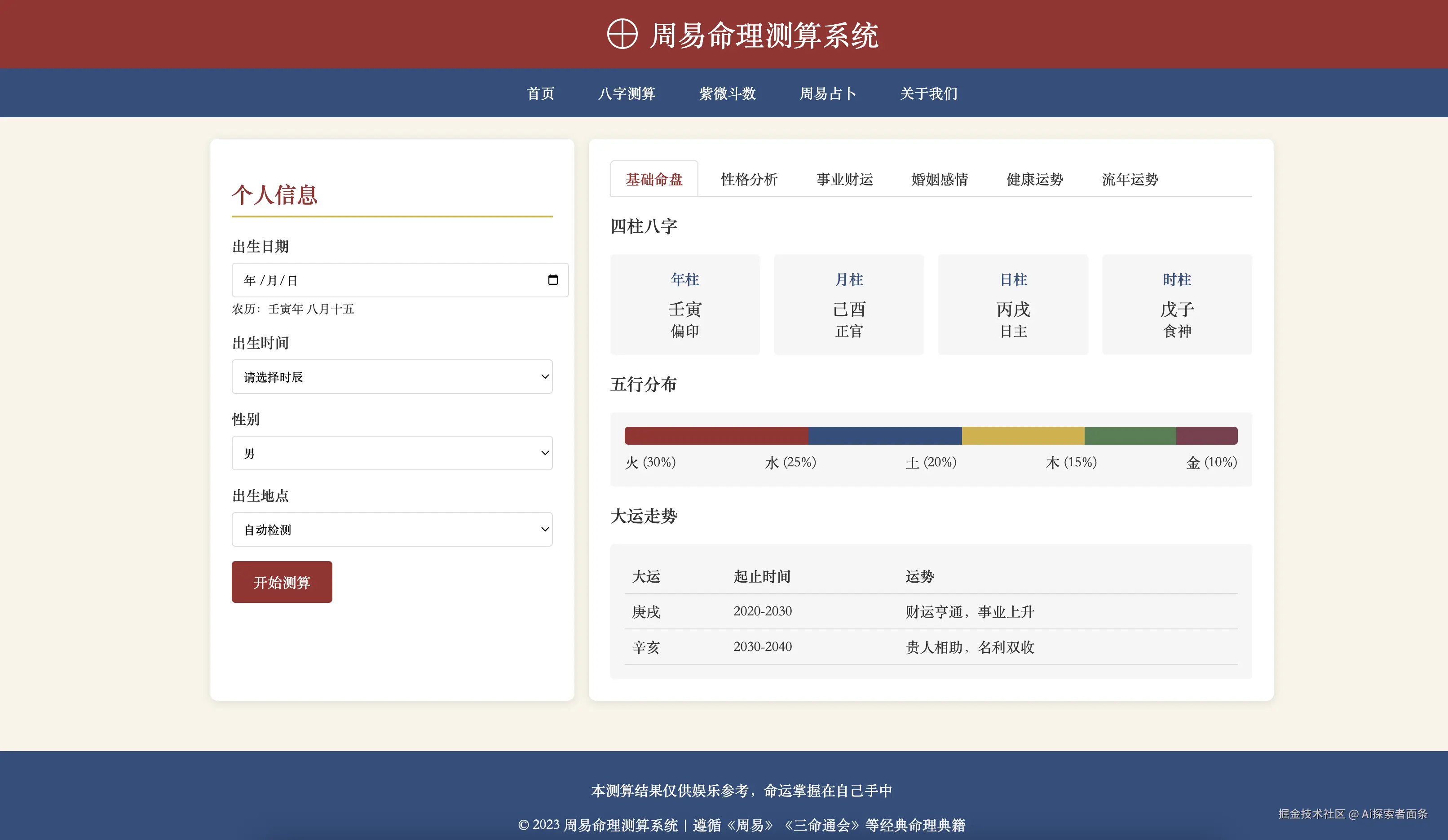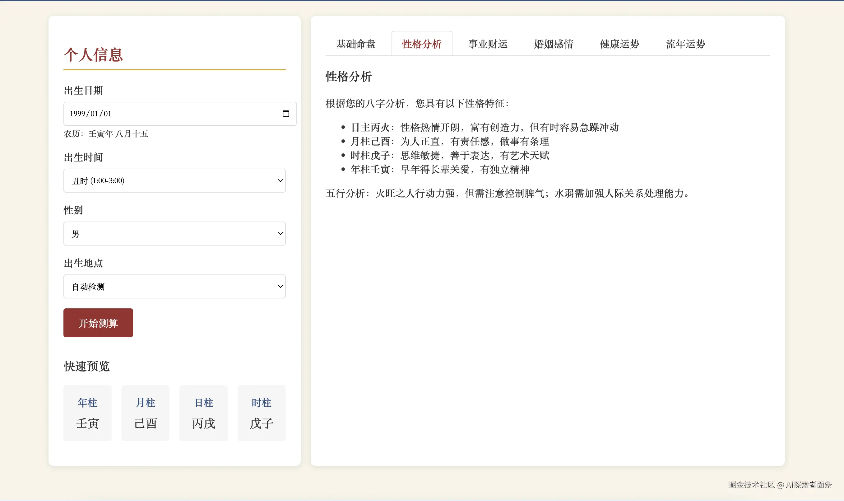 怎么样,配色和ui样式看起来都是比较像玄学命理,那么我们接下来输入信息来看一看。