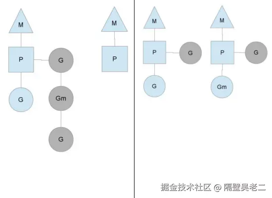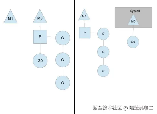 示意图:M0阻塞时,P转移至M1,M1执行其他G **。