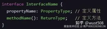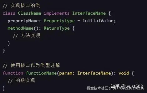 接口的定义:接口是一个抽象的类型,它规定了对象应该具备的结构,但不实现它。接口可以包含属性、方法,甚至是其他接口(称为嵌套接口)。下图是定义接口的基本语法。