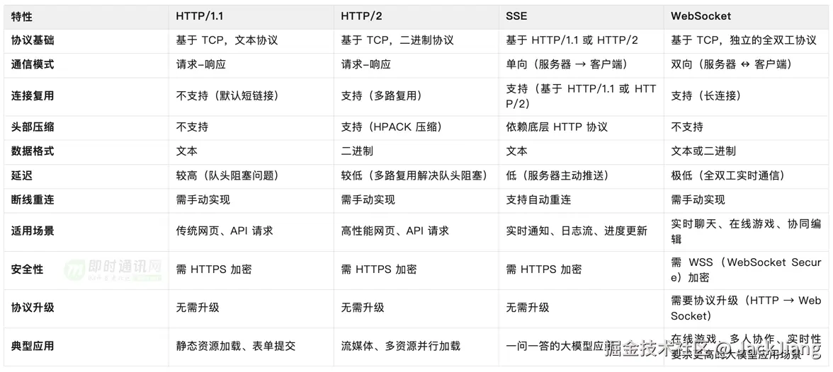**总结来看:**HTTP/1.1 适合传统网页和简单 API 请求,但性能较低。HTTP/2 适合现代高性能网页,解决了 HTTP/1.1 的队头阻塞问题,SSE 适合服务器主动推送实时数据的场景,如一问一答的大模型应用,WebSocket 适合需要双向实时通信的场景如在线游戏、多人协作、实时性要求更高的大模型应用场景(随时可以打断生成过程进行追问的场景,例如大模型实时辩论平台)。