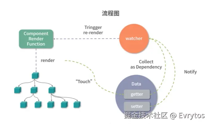 Proxy的 setter 被重写, 访问getter的时候会触发 trigger() ,trigger() 会读取副作用函数set,触发依赖身上的所有依赖函数