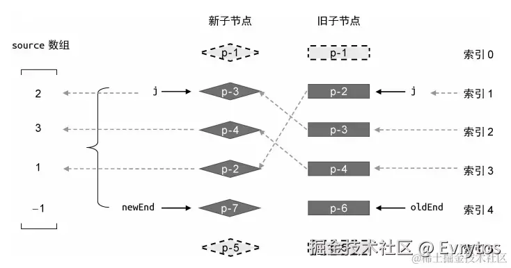 - 用于判断旧节点是否还在新数组中,以及通过旧元素所在的位置计算出 source