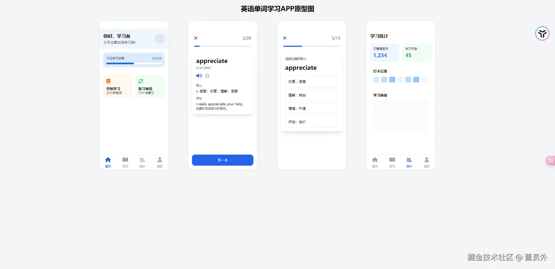 我想开发一个英语背单词的app要输出原型图,请通过以下方式帮我完成app所有原型图片的设计。