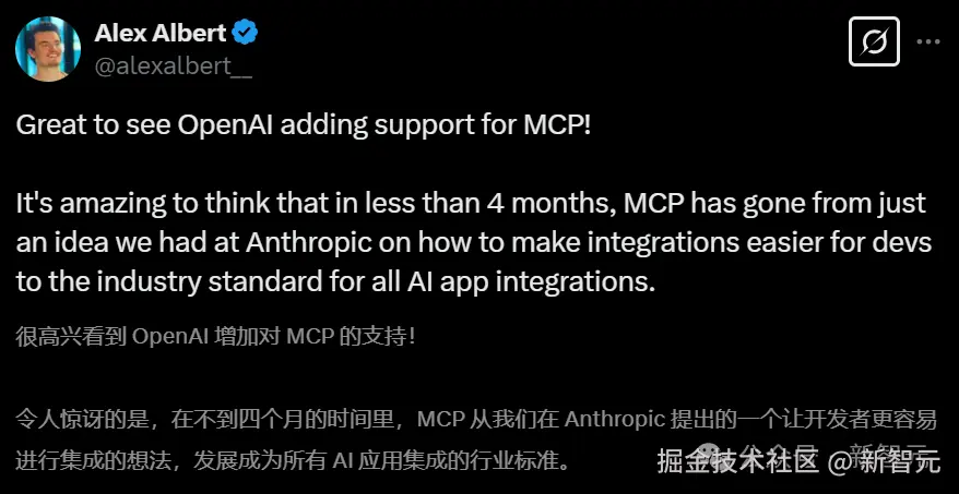 「很高兴看到 MCP 的热爱传递到了 OpenAI——欢迎!」Anthropic 的首席产品官 Mike Krieger 在 X 上发帖说。