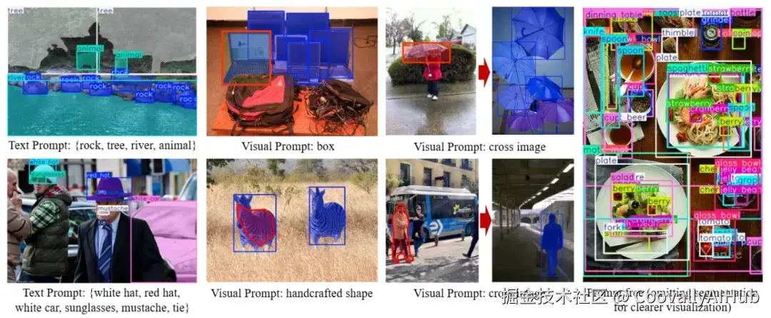 YOLOE首次在单一模型中整合了文本提示、视觉提示和无提示机制,实现了开放场景中的灵活物体检测和分割。