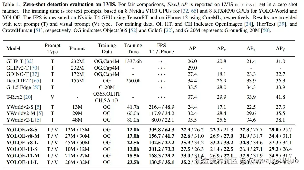 作者将YOLOE基于YOLOv8和YOLOv11架构开展了实验,并提供了不同的模型尺度。如下表所示,对于LVIS上的检测,YOLOE在不同模型尺度上表现出效率和零样本性能之间的良好平衡。