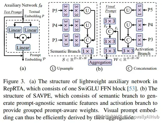- Re-parameterizable Region-Text Alignment (RepRTA): 通过轻量级辅助网络优化预训练的文本嵌入,增强视觉-文本对齐,且在推理和迁移时无额外开销。
