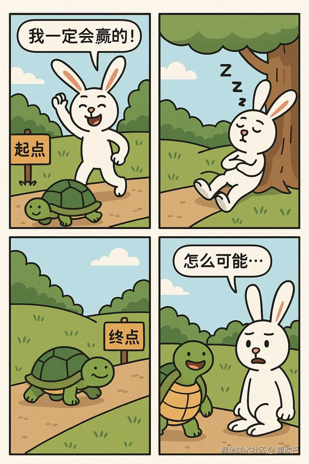 提示词:生成一个关于龟兔赛跑的搞笑漫画,4格图,文字使用中文