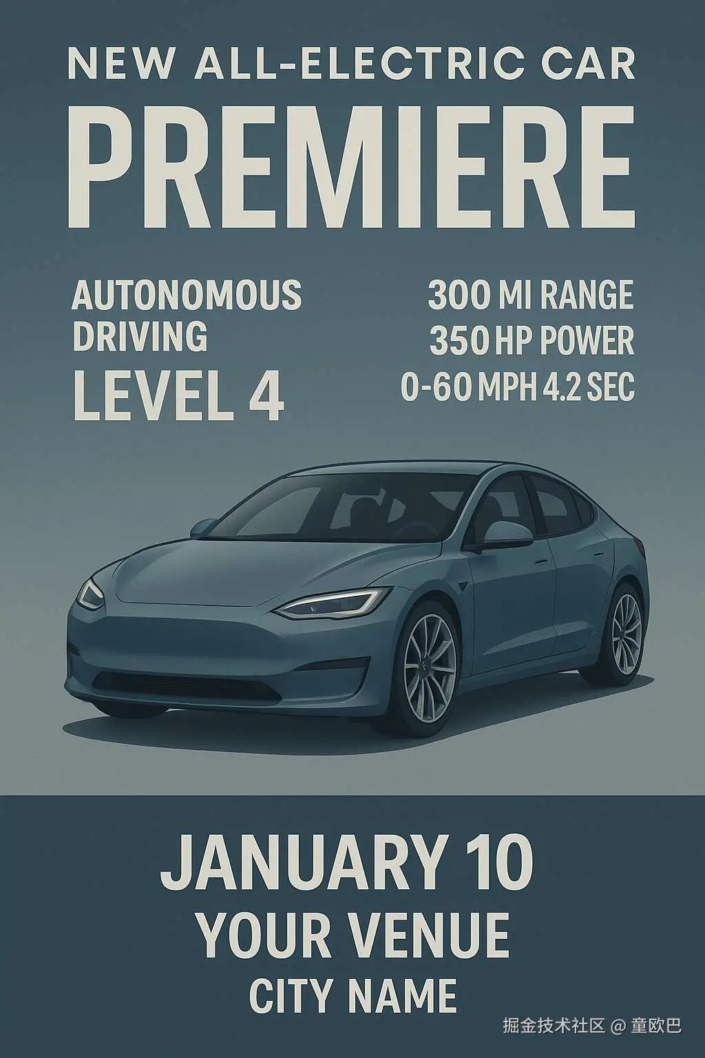 提示词:画一张电动汽车发布会的海报,包含自动驾驶和车型配置等详细信息