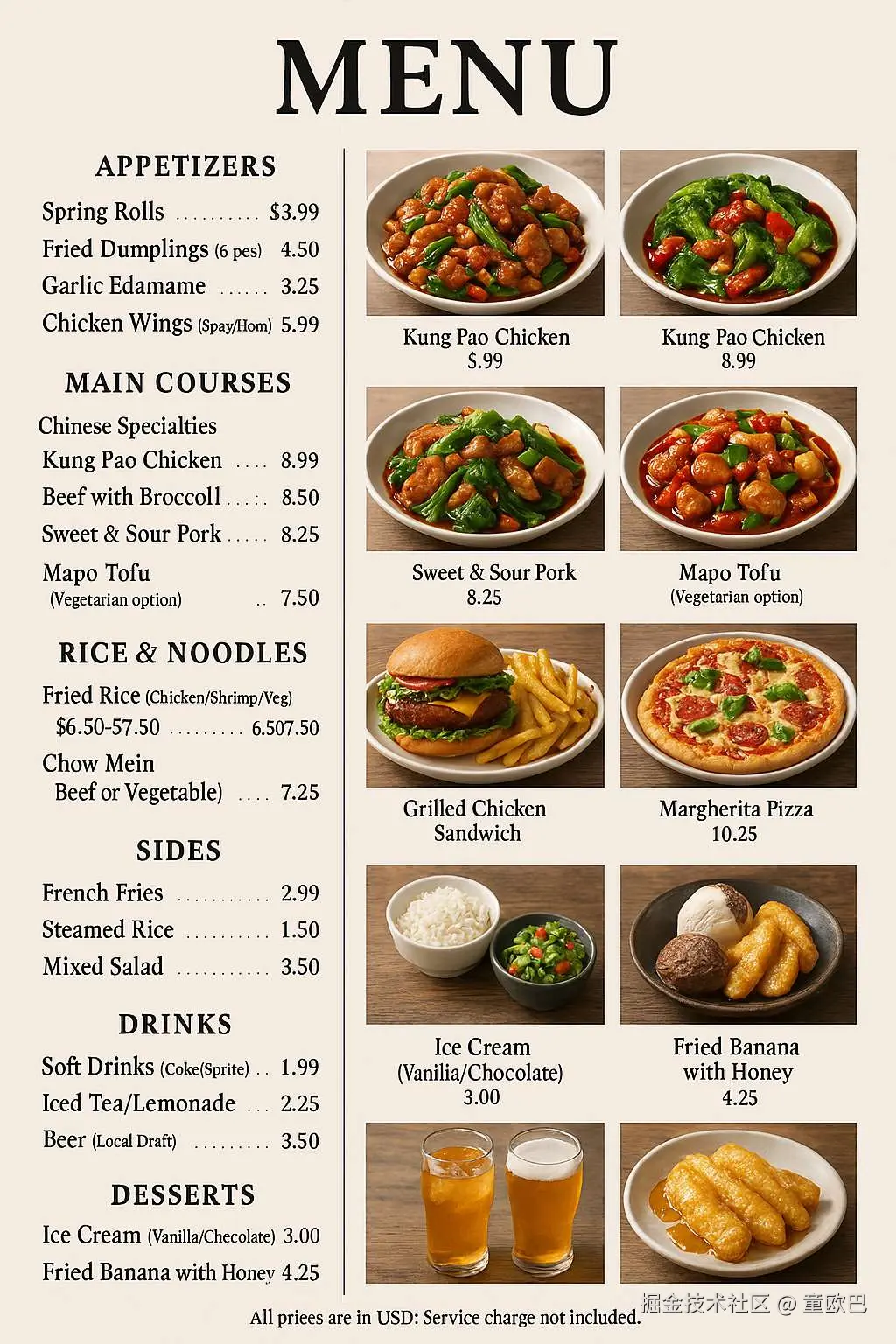提示词:创建一个餐馆的菜单图片,要有精美的配图和美观的设计