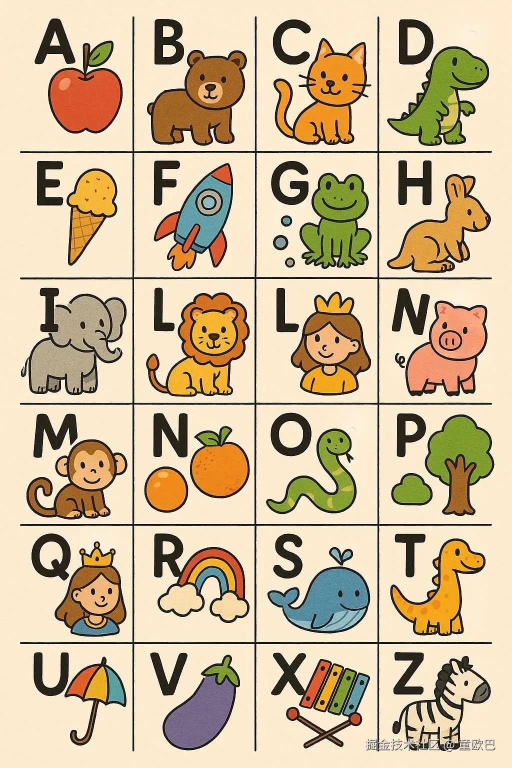 提示词:创建一个个英文字母表,必须包含全部英文字母,严格按照排列顺序,每个格子中都有对应的字母和相关的卡通形象