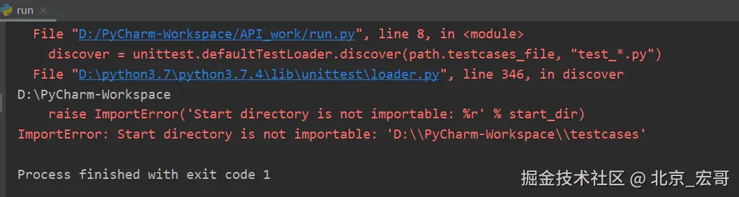 但第一种方式,在run.py中调用path.py中的base_dir属性,查找 "test_*.py" 的根目录就会出现下以报错: