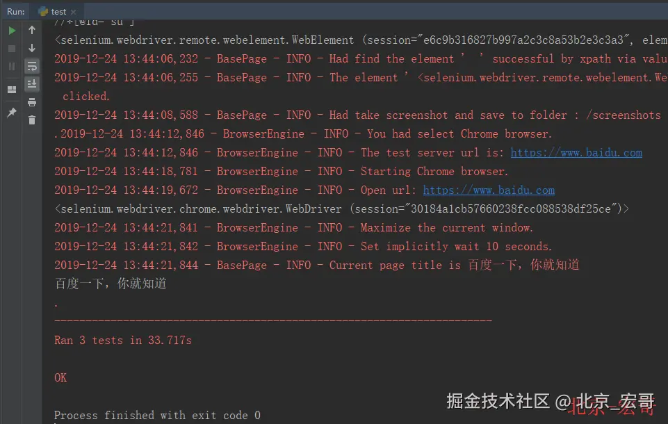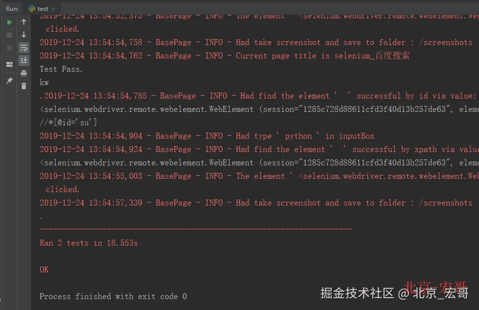 上面的testsuits是可以包名,也可以是一个文件夹名称,在实际脚本开发过程中,最后都采用这个方法来批量管理和执行几百上千的测试用例。下一篇内容,大概会介绍如何利用HTMLTestRunner.py这个开源的插件,生成测试报告,这个测试报告是一个HTML的格式。介绍完了生成报告文章,框架设计系列教程就会结束,不打算过多介绍其他技能点。