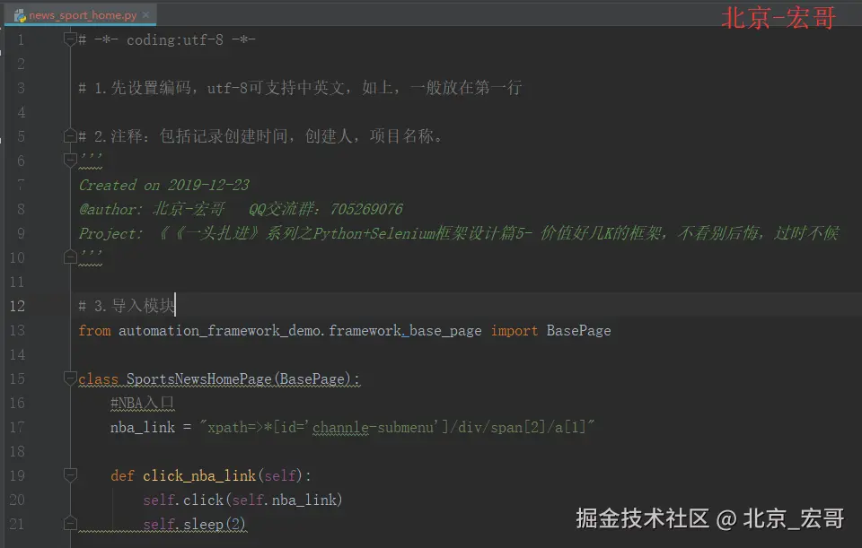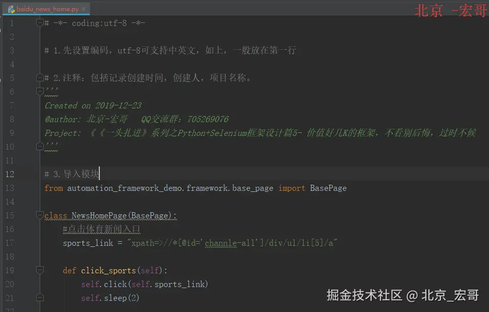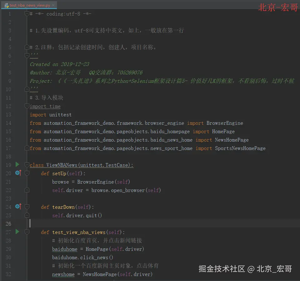 测试步骤大概是:百度首页点击新闻链接-进入新闻主页,点击体育-进入体育新闻主页,点击NBA-进入NBA页面-其他后续脚本操作。为什么要采用这样的步骤呢,干嘛不直接driver.get('nba的链接')?因为我们就是要利用POM的思想去写我们测试脚本,才有上面的测试步骤。