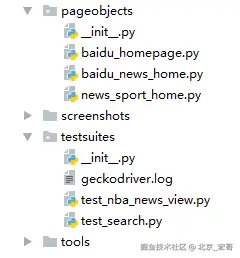 本小节宏哥将会进一步演示POM的具体实现,前面POM只是一个页面,一个测试脚本,现在我们要实现三个页面,两个测试脚本。在pageobjects包下,我新建了2个页面对象:百度新闻首页,百度体育新闻首页,具体文件结构如下图,其他和之前项目层级结构保持不变。