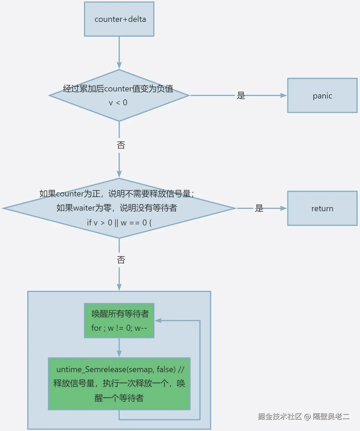 Add(2),也就是counter增加到 2,表示有两个任务需要执行。另一协程调用Wait(),waiter递增 1,当前协程进入阻塞状态(因为semaphore初始为0,所以当前携程睡眠)。其他协程完成任务后调用Done(),counter递减。当counter为 0 时,循环waiter次释放信号量,唤醒所有等待的协程。