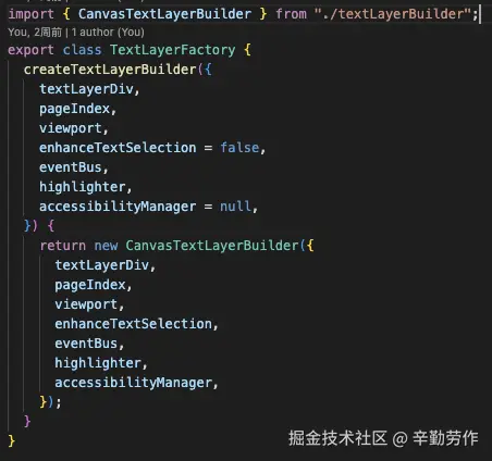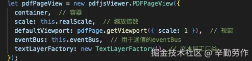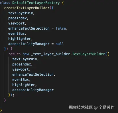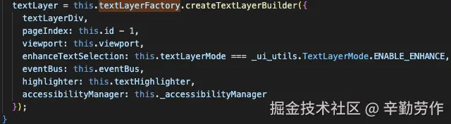 接下来我们看看textLayer具体是怎么创建的。我在项目中使用了pdf.js的PDFPageView类来实现pdf的展示,一个PDFPageView实例会负责pdf文档中一页的展示。如下图,在实例化该类时,构造函数会接收一个TextLayerFactory的实例对象作为参数,它会调用该实例对象的createTextLayerBuilder方法,以创建textLayer。