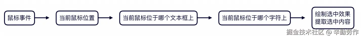 需要注意的是,受到源码的限制,这里的transform不是字符的基准线左侧的坐标,而是右侧。但有这个数据,就已经足够定位到每个字符了。我们可以整理出选中功能的实现思路: