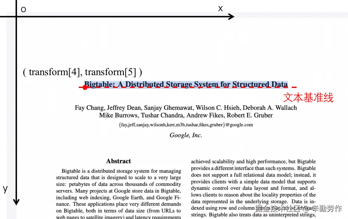 在大多数pdf文档中,文字都不会出现旋转的情况,此时,transform[1]和transform[2]为0,如果以当前pdf页面的左上角为原点,y轴向下,x轴向右建立坐标系,(transform[4], transform[5])则是该行文本的基准线(baseline)最左侧的坐标。在一行文本中,基准线同英语字母X的下沿端对齐,相当于英语四线三格本子中的第三条线,要计算基准线到文本顶部的距离,可以单独创建一个canvas,按照当前文本的字体和字号,渲染一个“A”,然后使用CanvasRenderingContext2D.measureText()这一API获取,具体可以参考MDN文档developer.mozilla.org/en-US/docs/…。计算出基准线到顶部的距离,配合width和height的值,我们就可以得到这一行文字的具体大小和位置了,从而可以判断当前鼠标是不是处于该行文本内。