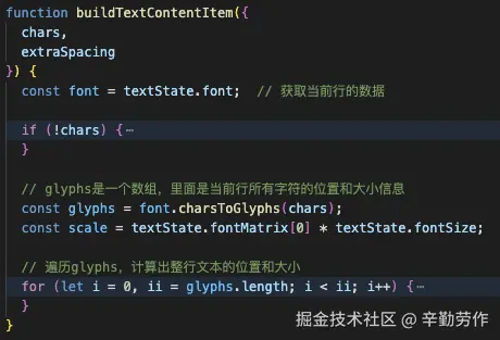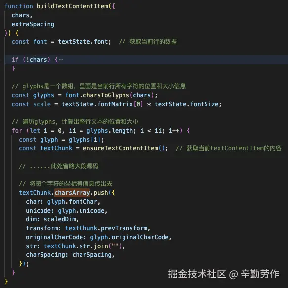 pdf.worker.js是pdf.js中用于解析pdf文档的脚本,位于目录pdfjs-dist/build下,其中文本层的解析主要由PartialEvaluator类完成,生成上一节所提到的textContent的核心是PartialEvaluator.getTextContent方法,该方法内定义了变量textContentItem,该变量最终会被push到textContent数组中,成为文本层的数据来源。而getTextContent方法中定义的函数buildTextContentItem则负责确定了textContentItem中多个重要字段的值,包括transform、宽高等。好消息是,buildTextContentItem做的主要工作,就是将一行文字中,一个个字符的大小和位置数据,整合成整行文字的数据,我们只需要将该函数里面一个个字符的数据都传出去,就可以得到每个字符的信息了!源码及核心修改如下: