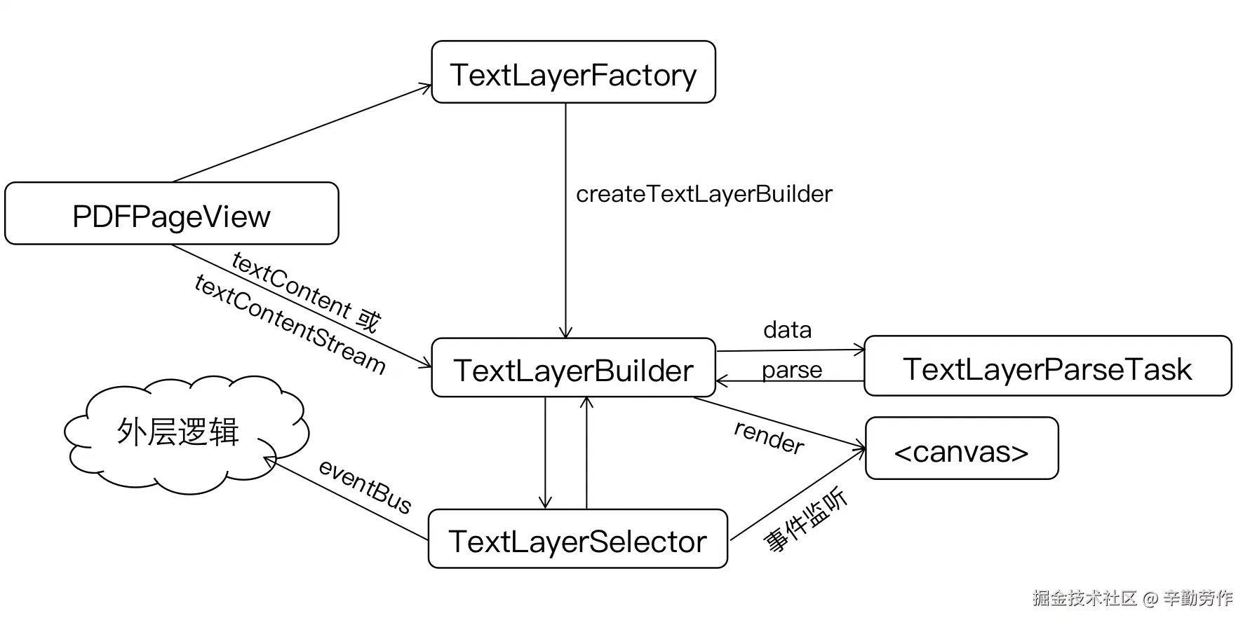 最后,我定义了一个TextLayerSelector类,处理选中相关的逻辑,通过监听鼠标事件判断用户的选中操作,将选中的起点和终点实时传给TextLayerBuilder类实例,由TextLayerBuilder绘制选中效果,并通过eventBus将选中的事件传递到阅读器外层,触发弹出菜单等操作。整体结构大致如下: