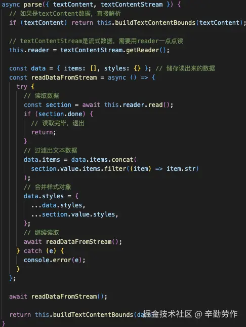 这里还定义了一个TextLayerParseTask类专门进行数据解析,它的parse方法会读取并解析数据,这里textContent和textContentStream是只会存在一个的,其中textContent是普通数据,可以直接解析,textContentStream则是流式数据,需要用reader进行读取。解析数据时调用的是buildTextContentBounds方法,该方法的主要是将数据变成我们喜欢的模样,上面已经介绍过textContent的数据结构和一些重要数据的计算方式了,在这里就不再赘述。