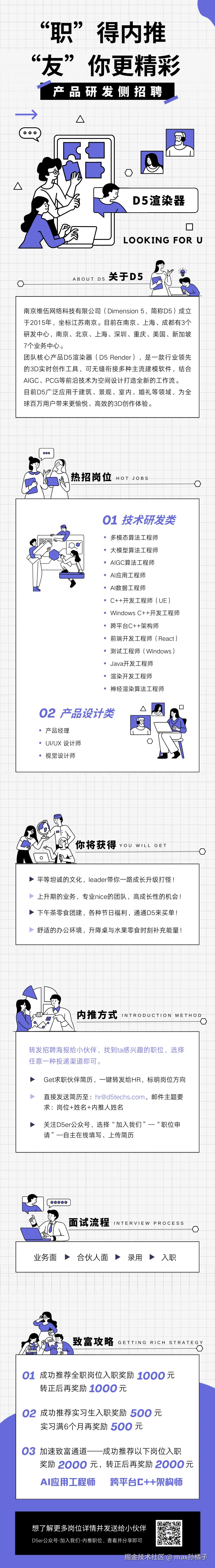 同时,D5始终保持着对最新技术的敏锐和关注,团队会不定期组织技术分享:基础的代码规范、各类技术语言的最新特性、前沿渲染技术的预研实现、实战项目的踩坑复盘等等,我们鼓励每一位工程师的主动分享,一起探讨技术,互相学习。