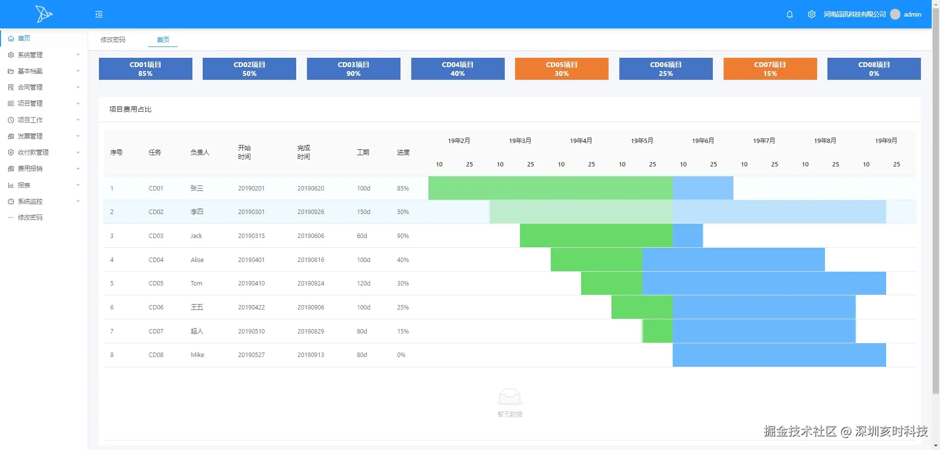 - 任务管理:记录项目的子任务信息,包括任务名称、描述、开始和结束日期、负责人、预算和进度等。