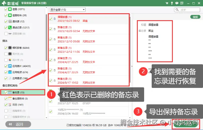 步骤3.选择并恢复备忘录到电脑,此步骤您可以单选,也可以多选,然后 “导出” 。另外,您也可以扫将扫描到的其他数据(比如照片、视频、聊天记录等),一键导出到电脑上。