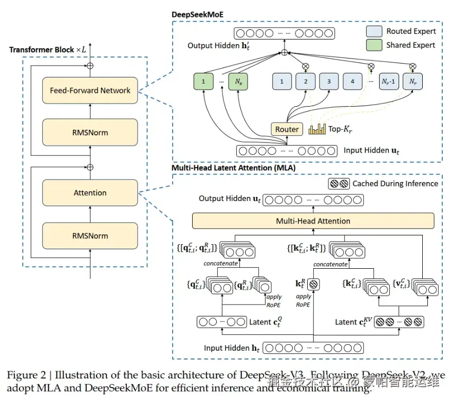 图2 DeepSeek-V3基本架构的示意图。继DeepSeek-V2之后,采用了MIA和DeepSeekMoE以实现高效推理和经济训练策略(Wang et al., 2024a),以减轻确保负载平衡所引发的性能下降。