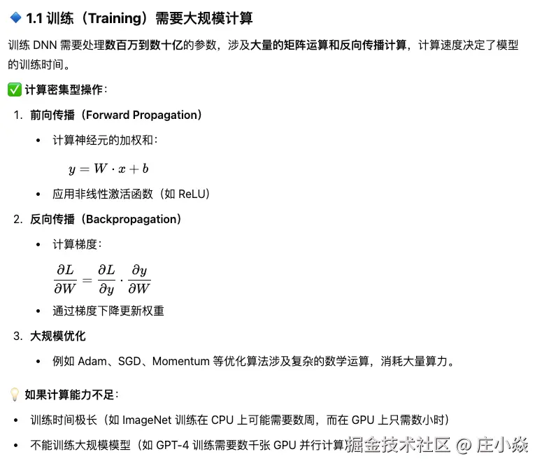 是的,深度神经网络(DNN) 的应用和发展高度依赖现代计算机的计算速度。DNN 需要大量的计算资源来训练和推理,特别是对于大规模数据和复杂模型(如 GPT、ResNet、Transformer),计算能力直接决定了其可行性和效率。