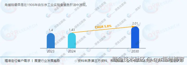 市场规模:预计未来几年全球角鲨烷市场将持续增长,到2030年市场规模将达到2.01亿美元,年复合增长率(CAGR)为5.8%。