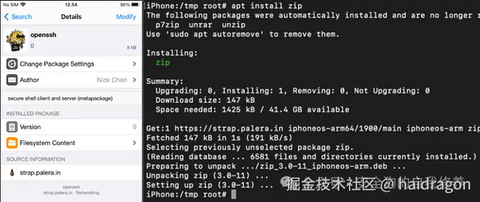 **概括地说,OpenSSH 是通过包管理器(比如 Cydia 或 Sileo)安装的,而是通过在 iOS shell 中运行来安装的。zip``apt install zip