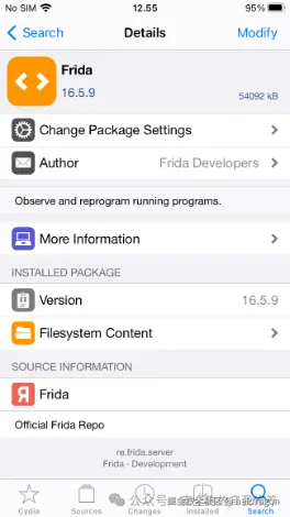 **对于 Frida Server,需要添加一个额外的存储库。在软件包管理器中,在 build.frida.re/ 处添加存储库。添加后,找到相应的 Frida Server 软件包并继续安装。