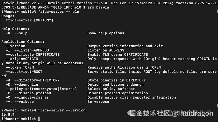 安装后,通过 SSH 连接到设备并检查已安装的 Frida 版本以确保一切设置正确,从而对其进行验证。