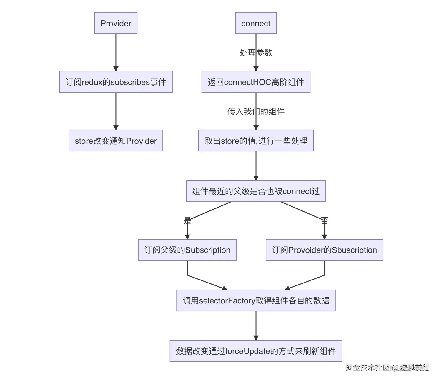 Provider组件的Context时会自动生成一个Subscription实例,它包含了我们的store,并使用redux store的subscribe(callback)订阅了最顶层的消息,即在整个store发生更新时得到通知,其逻辑和其他层级的subscribe是一致的 -