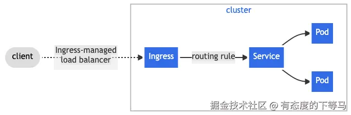 表象上Ingress从集群外部将HTTP和HTTPS路由引流到k8s集群中的Service。